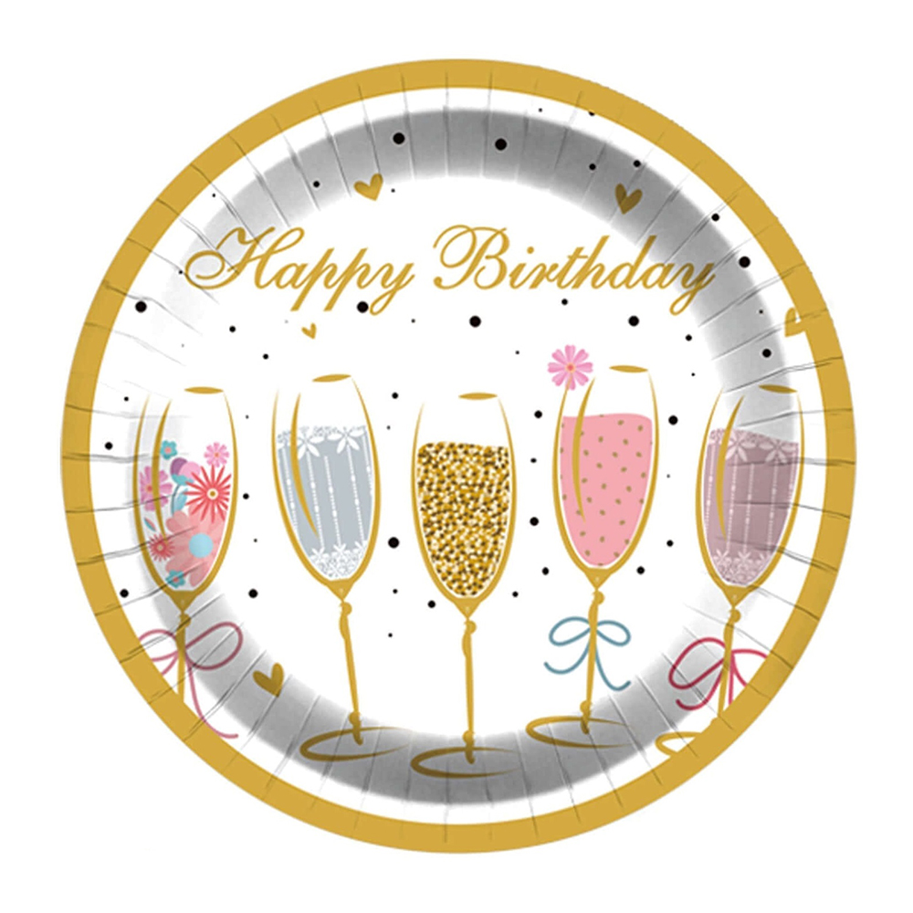 Set 8 buc farfurie tort alb, negru, auriu, 23 cm, happy birthday, PPPZ7374