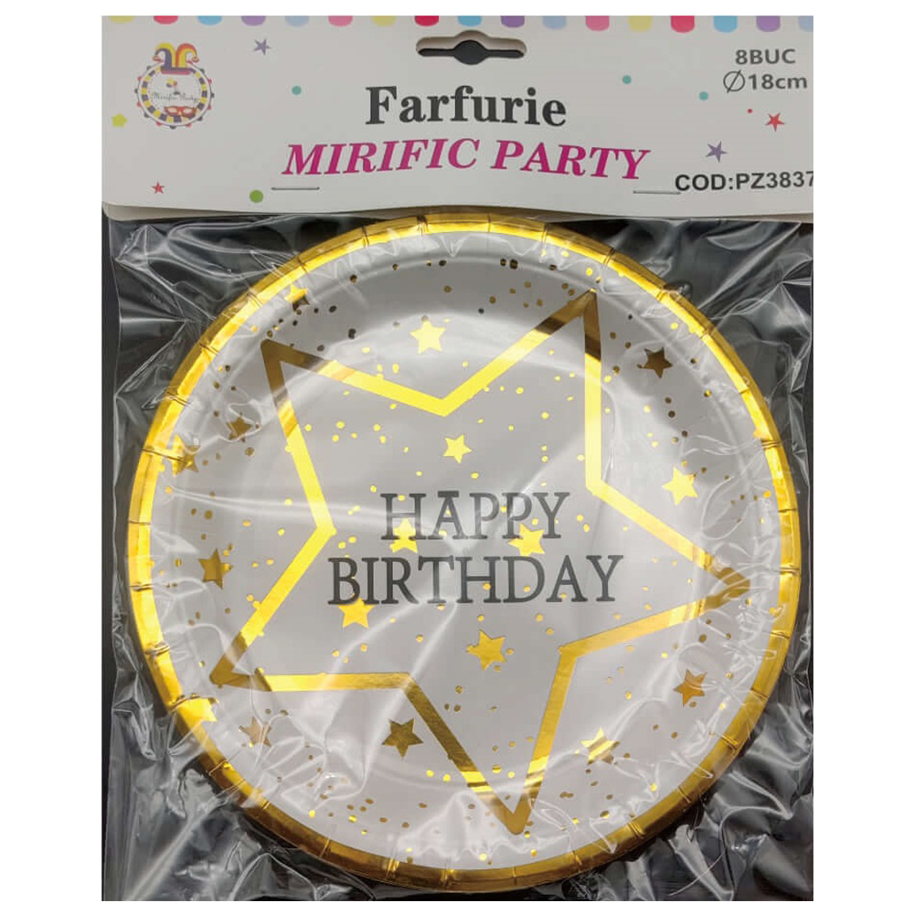 Set 8 buc farfurie tort alb, auriu, negru, 18 cm, stea, happy birthday, PZ3837. Pentru ca o petrecere să fie una de neuitat, ai nevoie de muzică bună, mâncăruri gustoase și băuturi răcoritoare, dar finalul culminant este tortul aniversar 🎂. Veselele party sunt kit-ul esențial pentru a oferi o petrecele colorată celor mici.