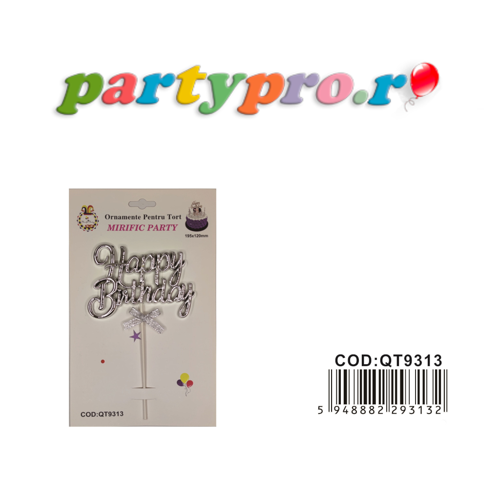 Topper argintiu, 195×120 mm, happy birthday. Un topper pentru tort este un obiect mic și decorativ, care poate fi utilizat pentru a adăuga un aspect personalizat și special tortului. Acesta poate fi realizat dintr-o varietate de materiale precum lemn, plastic, metal sau sticlă și poate fi decorat cu diverse ornamente precum flori, frunze, inimioare sau alte simboluri care să se potrivească aniversării sau evenimentului.