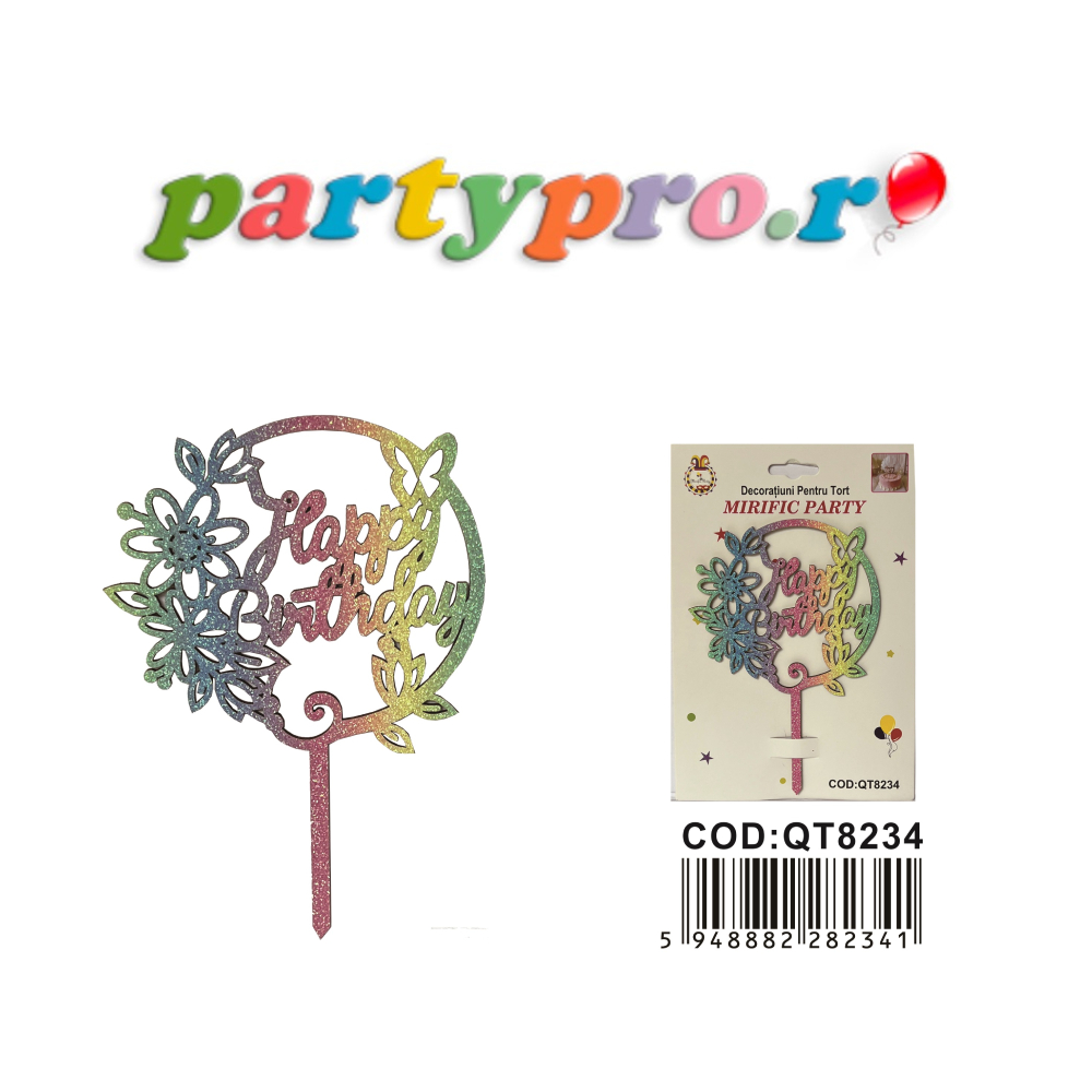Topper multicolor, happy birthday, PPQT8234. Un topper pentru tort este un obiect mic și decorativ, care poate fi utilizat pentru a adăuga un aspect personalizat și special tortului. Acesta poate fi realizat dintr-o varietate de materiale precum lemn, plastic, metal sau sticlă și poate fi decorat cu diverse ornamente precum flori, frunze, inimioare sau alte simboluri care să se potrivească aniversării sau evenimentului.