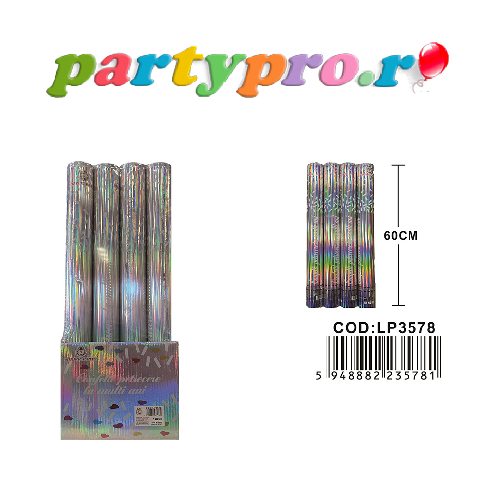 Tub confetti, argintiu, 60 cm, LP3578. O petrece de succes nu poate începe fără tunurile de confetti 🥳! Proiectilul acestora este inofensiv, iar majoritatea acestora sunt biodegradabile și prietenoase cu mediul. Sunt simplu de utilizat și se pot folosi pentru diverse evenimente (aniversare, nuntă, petreceri, etc.). Atenție! Prețul este per tub.